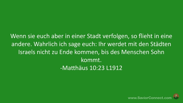 Wenn sie euch aber in einer Stadt verfolgen, so flieht in eine andere. Wahrlich ich sage euch: Ihr werdet mit den Städten Israels nicht zu Ende kommen, bis des Menschen Sohn kommt. -Matthäus 10:23 L1912