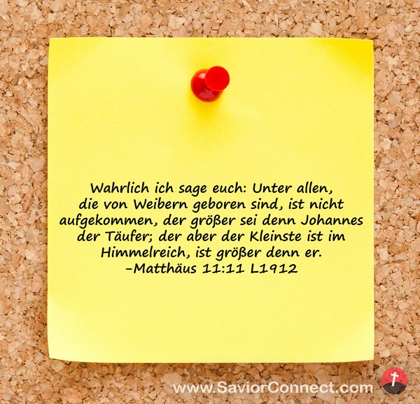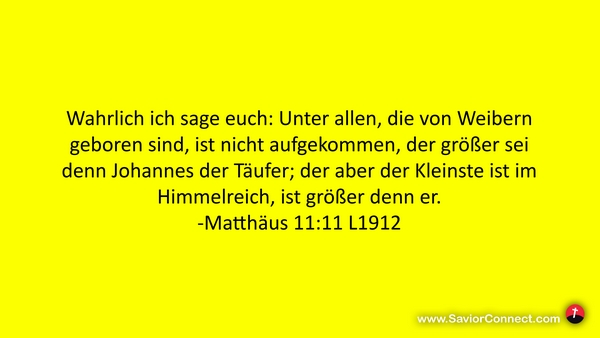 Wahrlich ich sage euch: Unter allen, die von Weibern geboren sind, ist nicht aufgekommen, der größer sei denn Johannes der Täufer; der aber der Kleinste ist im Himmelreich, ist größer denn er. -Matthäus 11:11 L1912