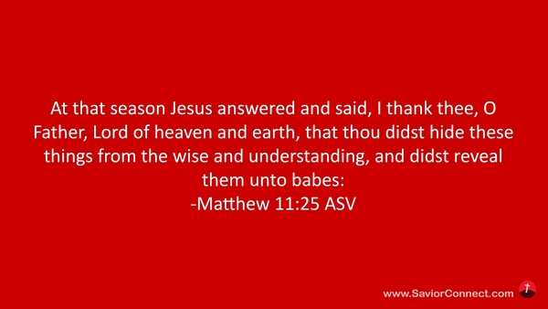 Zu der Zeit antwortete Jesus und sprach: Ich preise dich, Vater und HERR Himmels und der Erde, daß du solches den Weisen und Klugen verborgen hast und hast es den Unmündigen offenbart. -Matthäus 11:25 L1912