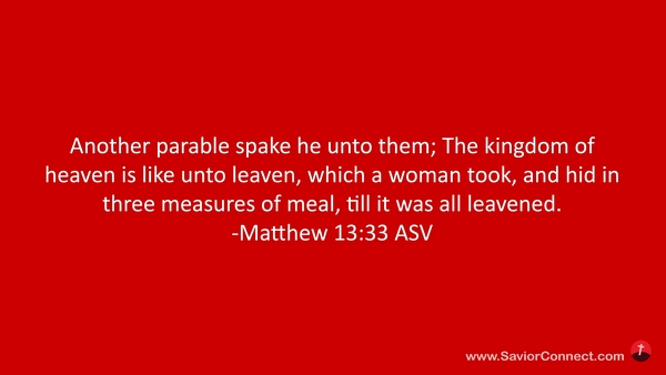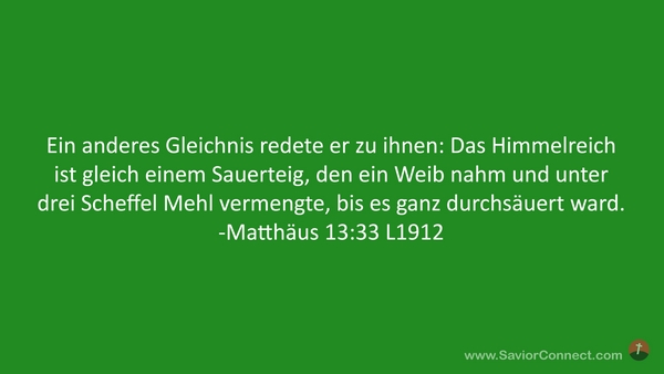 Ein anderes Gleichnis redete er zu ihnen: Das Himmelreich ist gleich einem Sauerteig, den ein Weib nahm und unter drei Scheffel Mehl vermengte, bis es ganz durchsäuert ward. -Matthäus 13:33 L1912
