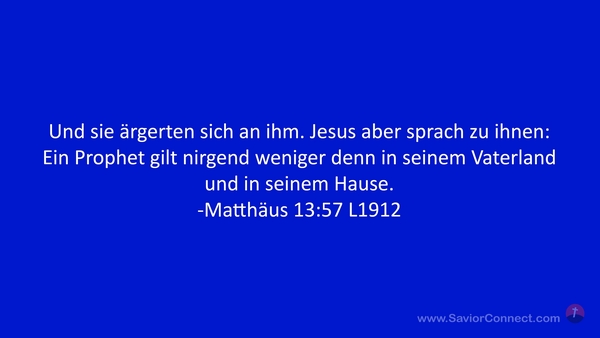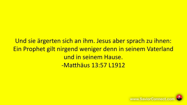 Und sie ärgerten sich an ihm. Jesus aber sprach zu ihnen: Ein Prophet gilt nirgend weniger denn in seinem Vaterland und in seinem Hause. -Matthäus 13:57 L1912