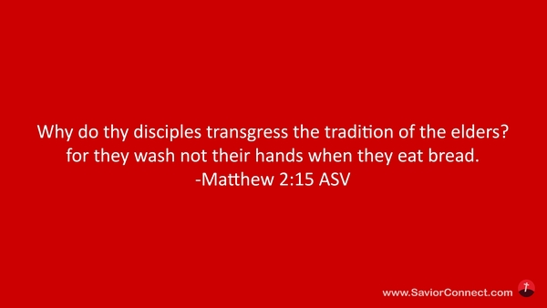 Warum übertreten deine Jünger der Ältesten Aufsätze? Sie waschen ihre Hände nicht, wenn sie Brot essen. -Matthäus 15:2 L1912