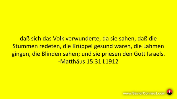 daß sich das Volk verwunderte, da sie sahen, daß die Stummen redeten, die Krüppel gesund waren, die Lahmen gingen, die Blinden sahen; und sie priesen den Gott Israels. -Matthäus 15:31 L1912