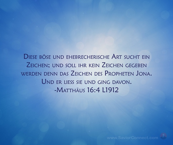 Diese böse und ehebrecherische Art sucht ein Zeichen; und soll ihr kein Zeichen gegeben werden denn das Zeichen des Propheten Jona. Und er ließ sie und ging davon. -Matthäus 16:4 L1912