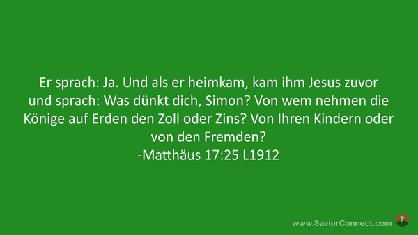 Er sprach: Ja. Und als er heimkam, kam ihm Jesus zuvor und sprach: Was dünkt dich, Simon? Von wem nehmen die Könige auf Erden den Zoll oder Zins? Von Ihren Kindern oder von den Fremden? -Matthäus 17:25 L1912