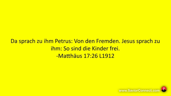 Da sprach zu ihm Petrus: Von den Fremden. Jesus sprach zu ihm: So sind die Kinder frei. -Matthäus 17:26 L1912