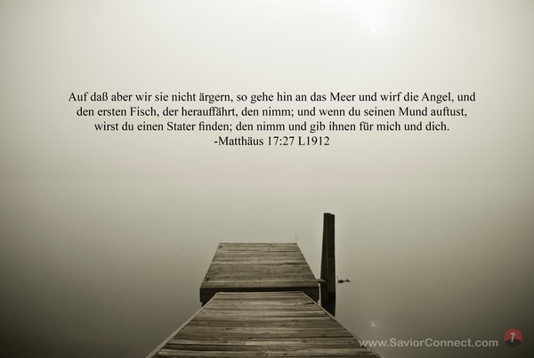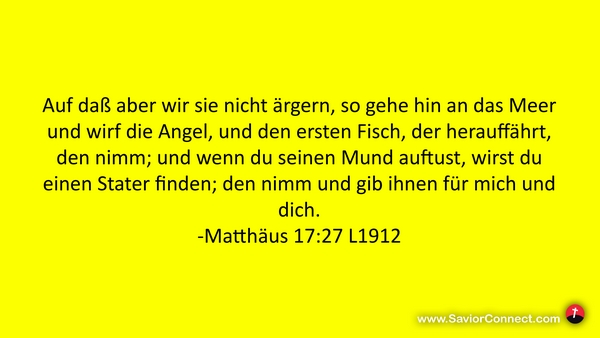 Auf daß aber wir sie nicht ärgern, so gehe hin an das Meer und wirf die Angel, und den ersten Fisch, der herauffährt, den nimm; und wenn du seinen Mund auftust, wirst du einen Stater finden; den nimm und gib ihnen für mich und dich. -Matthäus 17:27 L1912