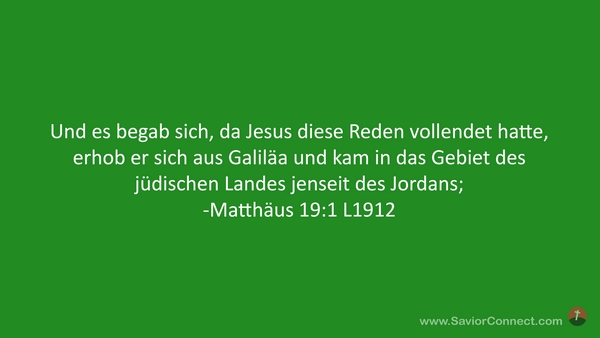 Und es begab sich, da Jesus diese Reden vollendet hatte, erhob er sich aus Galiläa und kam in das Gebiet des jüdischen Landes jenseit des Jordans; -Matthäus 19:1 L1912