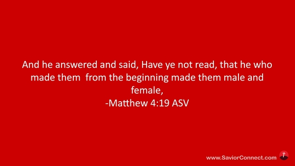 Er antwortete aber und sprach zu ihnen: Habt ihr nicht gelesen, daß, der im Anfang den Menschen gemacht hat, der machte, daß ein Mann und ein Weib sein sollte, -Matthäus 19:4 L1912