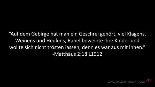 “Auf dem Gebirge hat man ein Geschrei gehört, viel Klagens, Weinens und Heulens; Rahel beweinte ihre Kinder und wollte sich nicht trösten lassen, denn es war aus mit ihnen.” -Matthäus 2:18 L1912