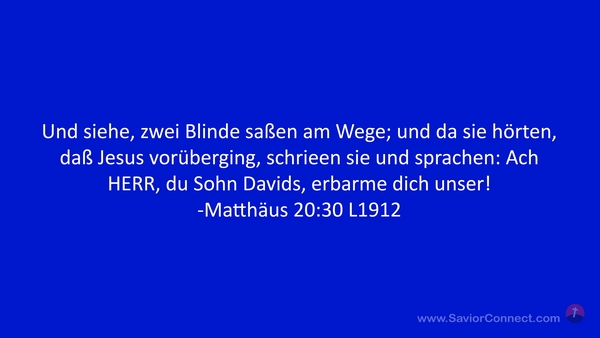 Und siehe, zwei Blinde saßen am Wege; und da sie hörten, daß Jesus vorüberging, schrieen sie und sprachen: Ach HERR, du Sohn Davids, erbarme dich unser! -Matthäus 20:30 L1912