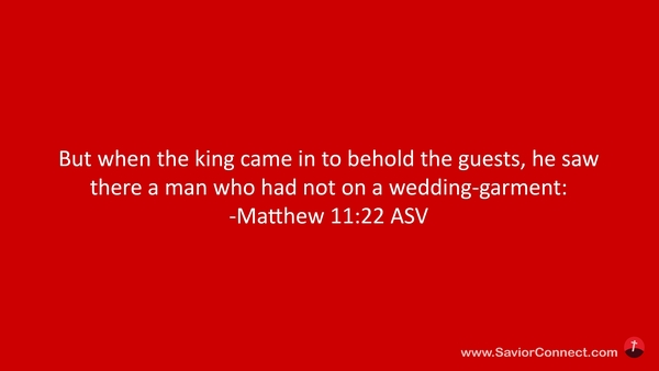 Da ging der König hinein, die Gäste zu besehen, und sah allda einen Menschen, der hatte kein hochzeitlich Kleid an; -Matthäus 22:11 L1912