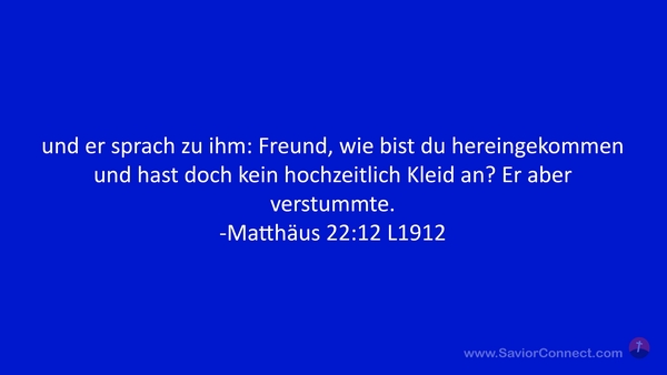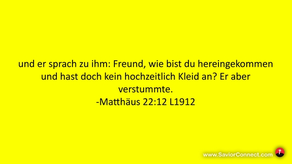 und er sprach zu ihm: Freund, wie bist du hereingekommen und hast doch kein hochzeitlich Kleid an? Er aber verstummte. -Matthäus 22:12 L1912