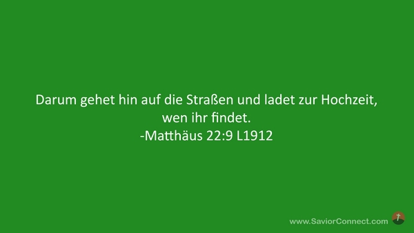 Darum gehet hin auf die Straßen und ladet zur Hochzeit, wen ihr findet. -Matthäus 22:9 L1912