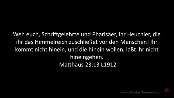 Weh euch, Schriftgelehrte und Pharisäer, ihr Heuchler, die ihr das Himmelreich zuschließet vor den Menschen! Ihr kommt nicht hinein, und die hinein wollen, laßt ihr nicht hineingehen. -Matthäus 23:13 L1912