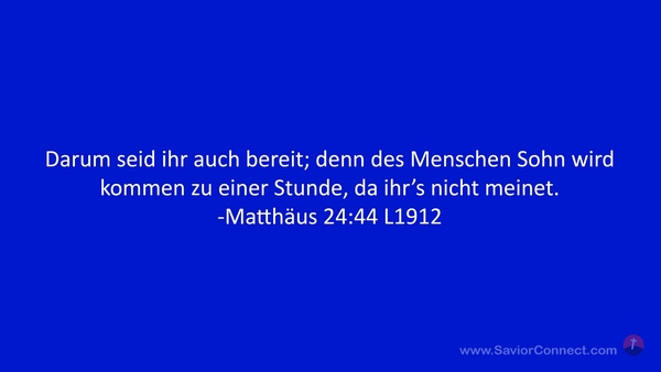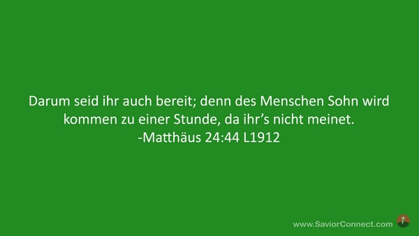 Darum seid ihr auch bereit; denn des Menschen Sohn wird kommen zu einer Stunde, da ihr's nicht meinet. -Matthäus 24:44 L1912