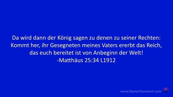 Da wird dann der König sagen zu denen zu seiner Rechten: Kommt her, ihr Gesegneten meines Vaters ererbt das Reich, das euch bereitet ist von Anbeginn der Welt! -Matthäus 25:34 L1912
