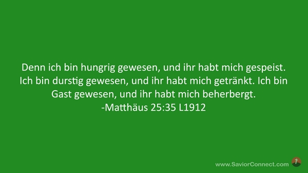 Denn ich bin hungrig gewesen, und ihr habt mich gespeist. Ich bin durstig gewesen, und ihr habt mich getränkt. Ich bin Gast gewesen, und ihr habt mich beherbergt. -Matthäus 25:35 L1912