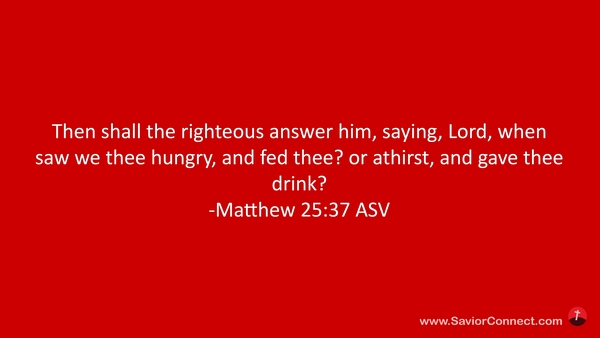 Dann werden ihm die Gerechten antworten und sagen: Wann haben wir dich hungrig gesehen und haben dich gespeist? oder durstig und haben dich getränkt? -Matthäus 25:37 L1912