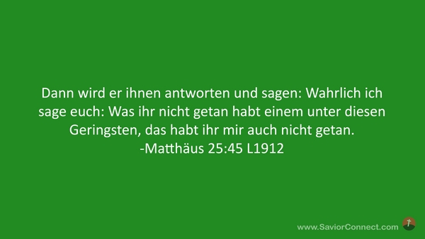 Dann wird er ihnen antworten und sagen: Wahrlich ich sage euch: Was ihr nicht getan habt einem unter diesen Geringsten, das habt ihr mir auch nicht getan. -Matthäus 25:45 L1912
