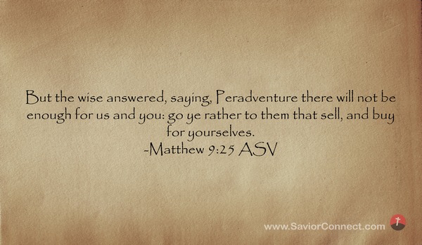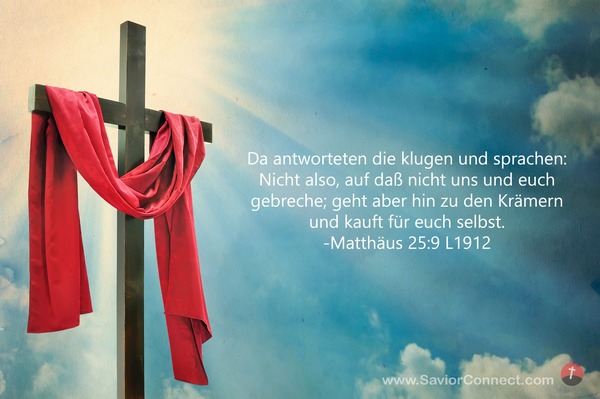 Da antworteten die klugen und sprachen: Nicht also, auf daß nicht uns und euch gebreche; geht aber hin zu den Krämern und kauft für euch selbst. -Matthäus 25:9 L1912