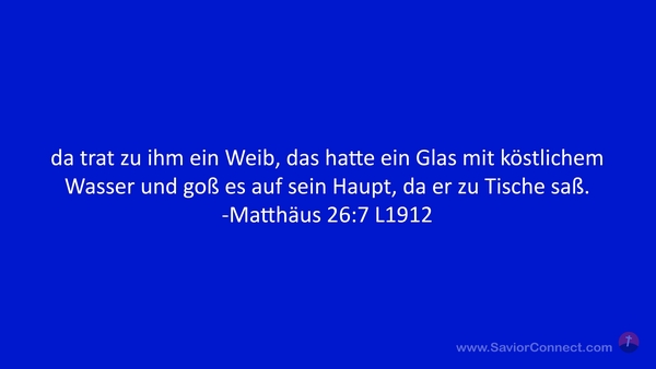 da trat zu ihm ein Weib, das hatte ein Glas mit köstlichem Wasser und goß es auf sein Haupt, da er zu Tische saß. -Matthäus 26:7 L1912