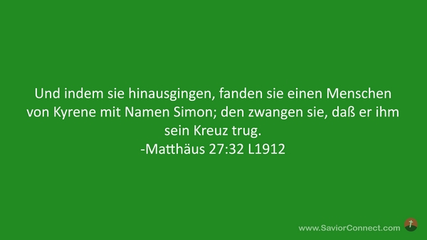 Und indem sie hinausgingen, fanden sie einen Menschen von Kyrene mit Namen Simon; den zwangen sie, daß er ihm sein Kreuz trug. -Matthäus 27:32 L1912