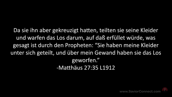 Da sie ihn aber gekreuzigt hatten, teilten sie seine Kleider und warfen das Los darum, auf daß erfüllet würde, was gesagt ist durch den Propheten: “Sie haben meine Kleider unter sich geteilt, und über mein Gewand haben sie das Los geworfen.” -Matthäus 27:35 L1912