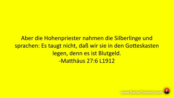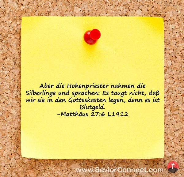 Aber die Hohenpriester nahmen die Silberlinge und sprachen: Es taugt nicht, daß wir sie in den Gotteskasten legen, denn es ist Blutgeld. -Matthäus 27:6 L1912