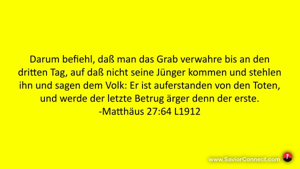 Darum befiehl, daß man das Grab verwahre bis an den dritten Tag, auf daß nicht seine Jünger kommen und stehlen ihn und sagen dem Volk: Er ist auferstanden von den Toten, und werde der letzte Betrug ärger denn der erste. -Matthäus 27:64 L1912