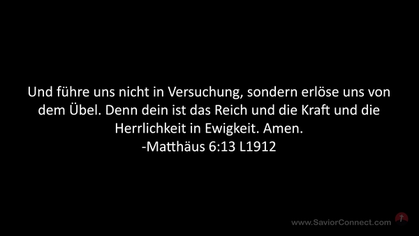 Und führe uns nicht in Versuchung, sondern erlöse uns von dem Übel. Denn dein ist das Reich und die Kraft und die Herrlichkeit in Ewigkeit. Amen. -Matthäus 6:13 L1912