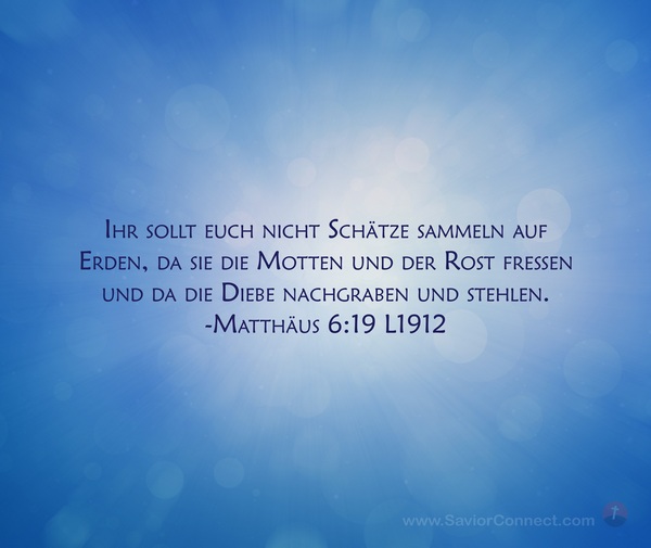 Ihr sollt euch nicht Schätze sammeln auf Erden, da sie die Motten und der Rost fressen und da die Diebe nachgraben und stehlen. -Matthäus 6:19 L1912