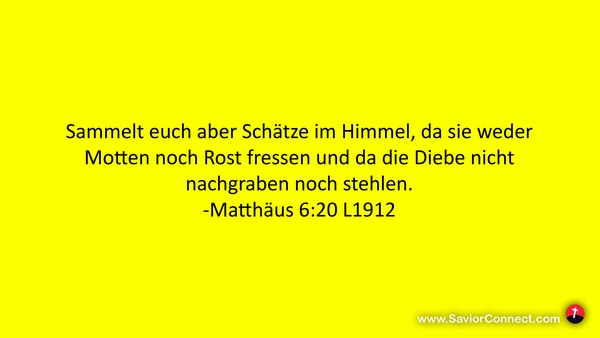 Sammelt euch aber Schätze im Himmel, da sie weder Motten noch Rost fressen und da die Diebe nicht nachgraben noch stehlen. -Matthäus 6:20 L1912