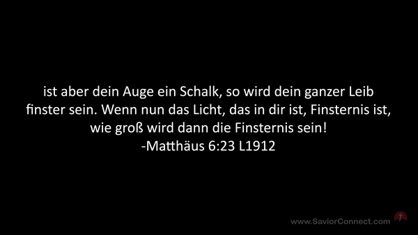 ist aber dein Auge ein Schalk, so wird dein ganzer Leib finster sein. Wenn nun das Licht, das in dir ist, Finsternis ist, wie groß wird dann die Finsternis sein! -Matthäus 6:23 L1912