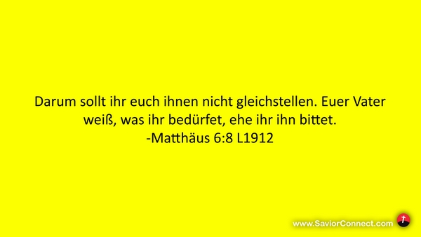 Darum sollt ihr euch ihnen nicht gleichstellen. Euer Vater weiß, was ihr bedürfet, ehe ihr ihn bittet. -Matthäus 6:8 L1912