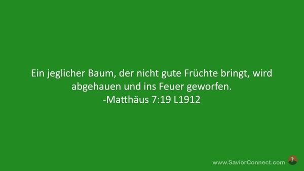 Ein jeglicher Baum, der nicht gute Früchte bringt, wird abgehauen und ins Feuer geworfen. -Matthäus 7:19 L1912