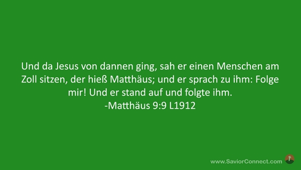 Und da Jesus von dannen ging, sah er einen Menschen am Zoll sitzen, der hieß Matthäus; und er sprach zu ihm: Folge mir! Und er stand auf und folgte ihm. -Matthäus 9:9 L1912