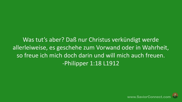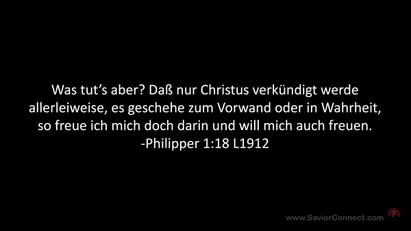 Was tut's aber? Daß nur Christus verkündigt werde allerleiweise, es geschehe zum Vorwand oder in Wahrheit, so freue ich mich doch darin und will mich auch freuen. -Philipper 1:18 L1912