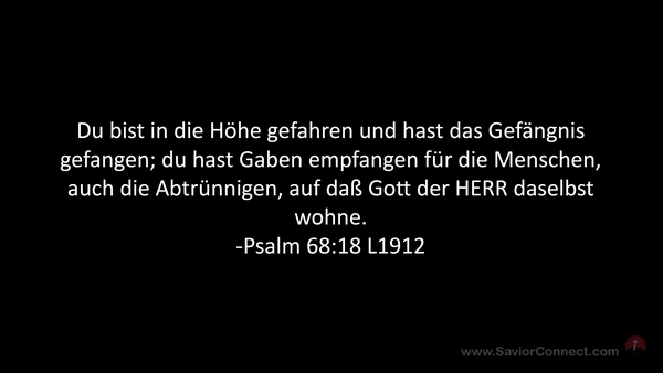 Du bist in die Höhe gefahren und hast das Gefängnis gefangen; du hast Gaben empfangen für die Menschen, auch die Abtrünnigen, auf daß Gott der HERR daselbst wohne. -Psalm 68:18 L1912