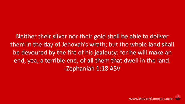 Es wird sie ihr Silber und Gold nicht erretten können am Tage des Zorns des HERRN, sondern das ganze Land soll durch das Feuer seines Eifers verzehrt werden; denn er wird plötzlich ein Ende machen mit allen, die im Lande wohnen. -Zephanja 1:18 L1912