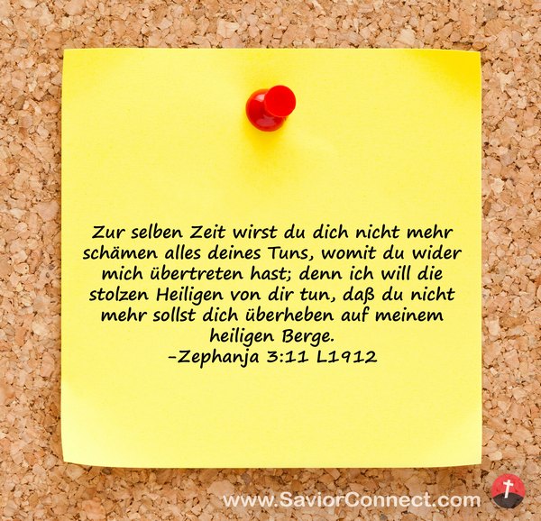 Zur selben Zeit wirst du dich nicht mehr schämen alles deines Tuns, womit du wider mich übertreten hast; denn ich will die stolzen Heiligen von dir tun, daß du nicht mehr sollst dich überheben auf meinem heiligen Berge. -Zephanja 3:11 L1912