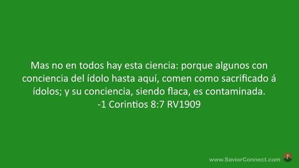 Mas no en todos hay esta ciencia: porque algunos con conciencia del ídolo hasta aquí, comen como sacrificado á ídolos; y su conciencia, siendo flaca, es contaminada. -1 Corintios 8:7 RV1909