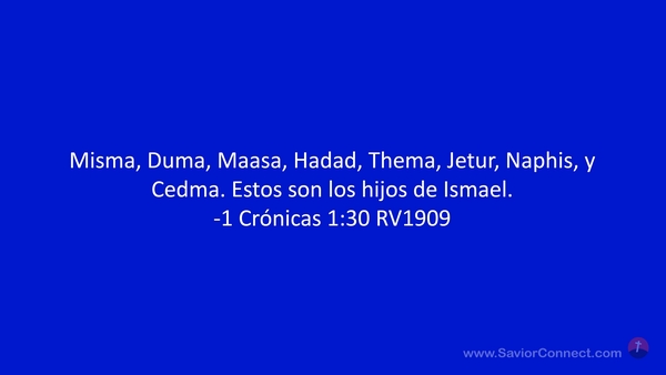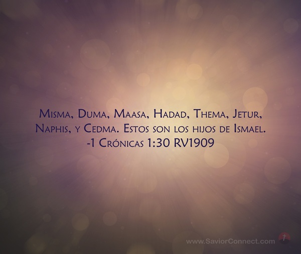 Misma, Duma, Maasa, Hadad, Thema, Jetur, Naphis, y Cedma. Estos son los hijos de Ismael. -1 Crónicas 1:30 RV1909