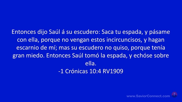 Entonces dijo Saúl á su escudero: Saca tu espada, y pásame con ella, porque no vengan estos incircuncisos, y hagan escarnio de mí; mas su escudero no quiso, porque tenía gran miedo. Entonces Saúl tomó la espada, y echóse sobre ella. -1 Crónicas 10:4 RV1909