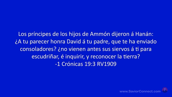 Los príncipes de los hijos de Ammón dijeron á Hanán: ¿A tu parecer honra David á tu padre, que te ha enviado consoladores? ¿no vienen antes sus siervos á ti para escudriñar, é inquirir, y reconocer la tierra? -1 Crónicas 19:3 RV1909