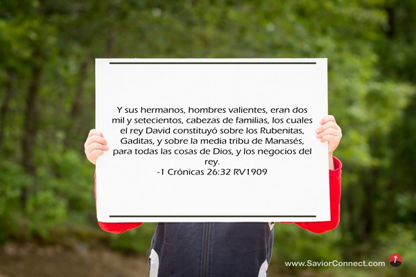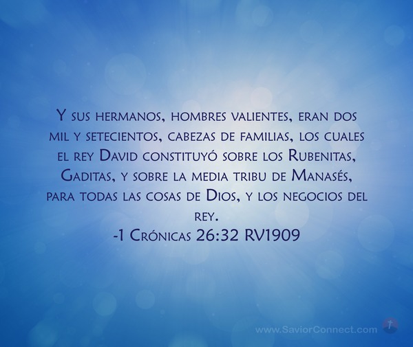 Y sus hermanos, hombres valientes, eran dos mil y setecientos, cabezas de familias, los cuales el rey David constituyó sobre los Rubenitas, Gaditas, y sobre la media tribu de Manasés, para todas las cosas de Dios, y los negocios del rey. -1 Crónicas 26:32 RV1909