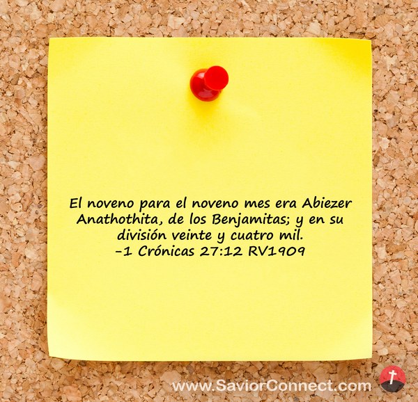 El noveno para el noveno mes era Abiezer Anathothita, de los Benjamitas; y en su división veinte y cuatro mil. -1 Crónicas 27:12 RV1909