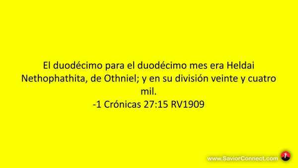 El duodécimo para el duodécimo mes era Heldai Nethophathita, de Othniel; y en su división veinte y cuatro mil. -1 Crónicas 27:15 RV1909