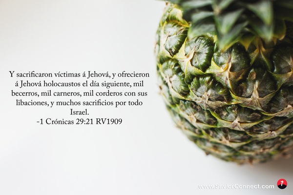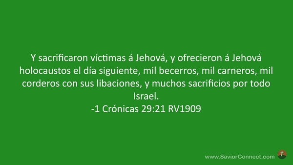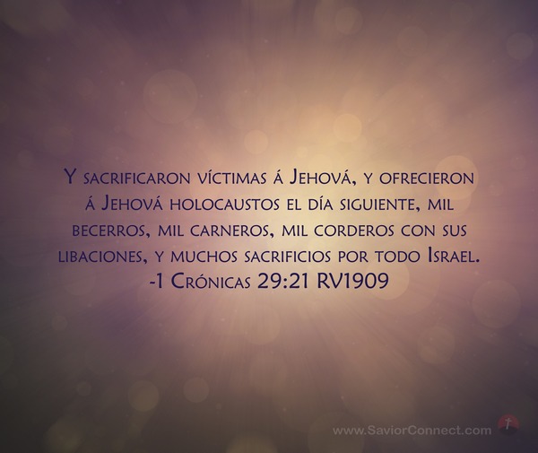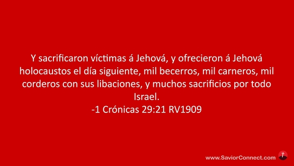 Y sacrificaron víctimas á Jehová, y ofrecieron á Jehová holocaustos el día siguiente, mil becerros, mil carneros, mil corderos con sus libaciones, y muchos sacrificios por todo Israel. -1 Crónicas 29:21 RV1909
