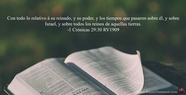Con todo lo relativo á su reinado, y su poder, y los tiempos que pasaron sobre él, y sobre Israel, y sobre todos los reinos de aquellas tierras. -1 Crónicas 29:30 RV1909
